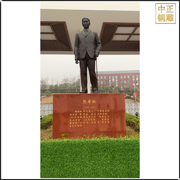 湖南工業大學陶瓷學院門前的這尊高3.8米的熊希齡人物銅雕塑,是由河北中正銅工藝品制作有限公司制作而成,這尊熊希齡人物銅雕塑高3.8米,底座高2米,總高5.8米。從最初圖紙設計到安裝完成,總共歷時2個月時間,安裝完成后得到了院長和眾多老師的一致好評。